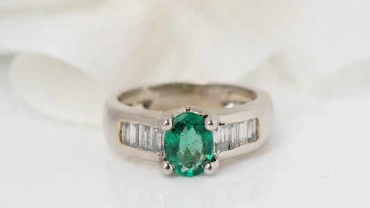 Bague de luxe en or blanc, émeraude et diamants baguettes