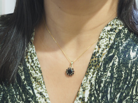 Collier volutes en or jaune et argent, grenat diamants et perle