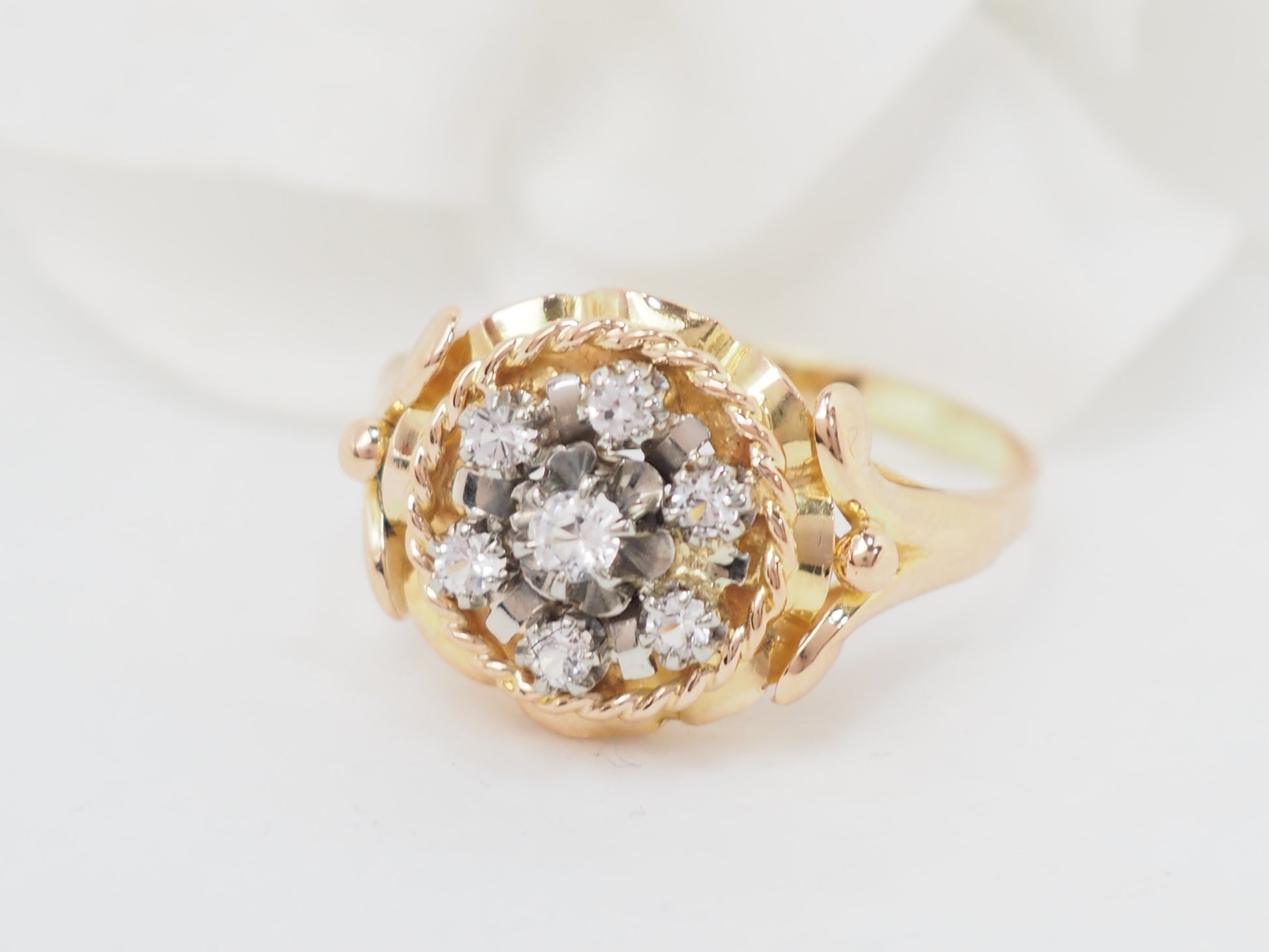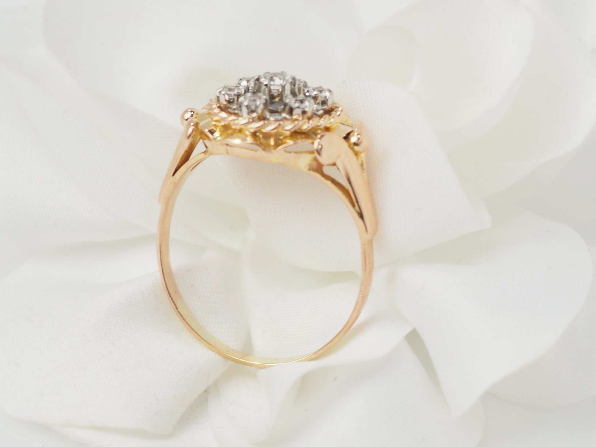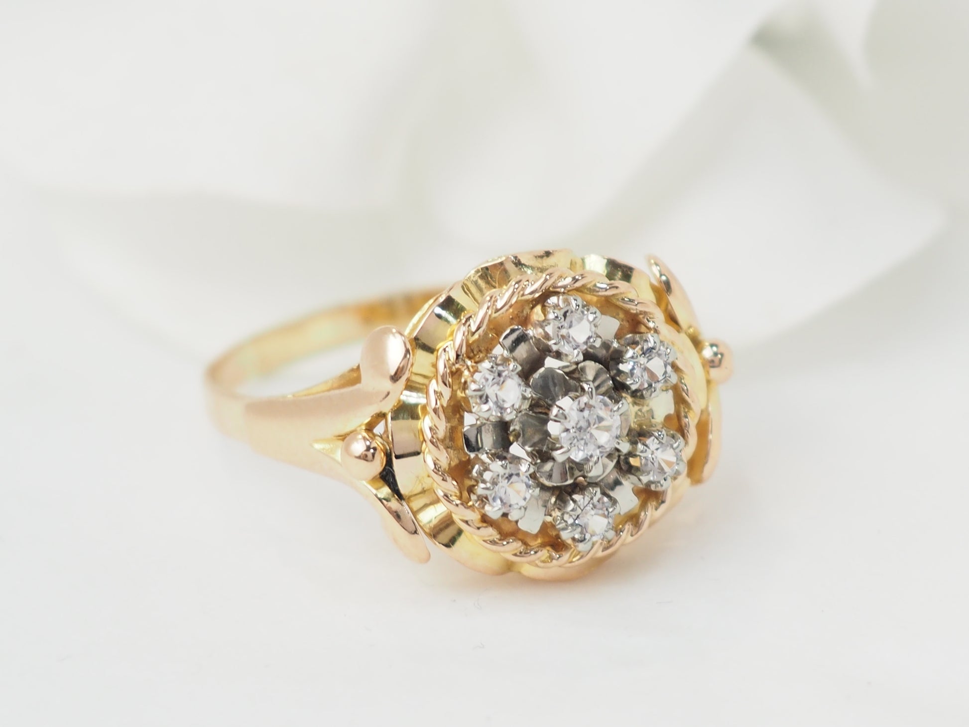 Bague ; Or jaune 18kt/750 millièmes, Sertie de pierres blanches ; Poids : 4,43gr ; Tour de doigt : 63 ; Dimensions plateau : 14x17mm ; Epoque : années 60.