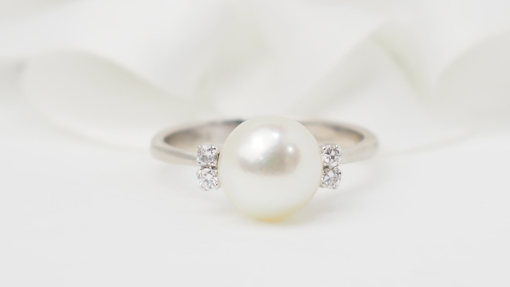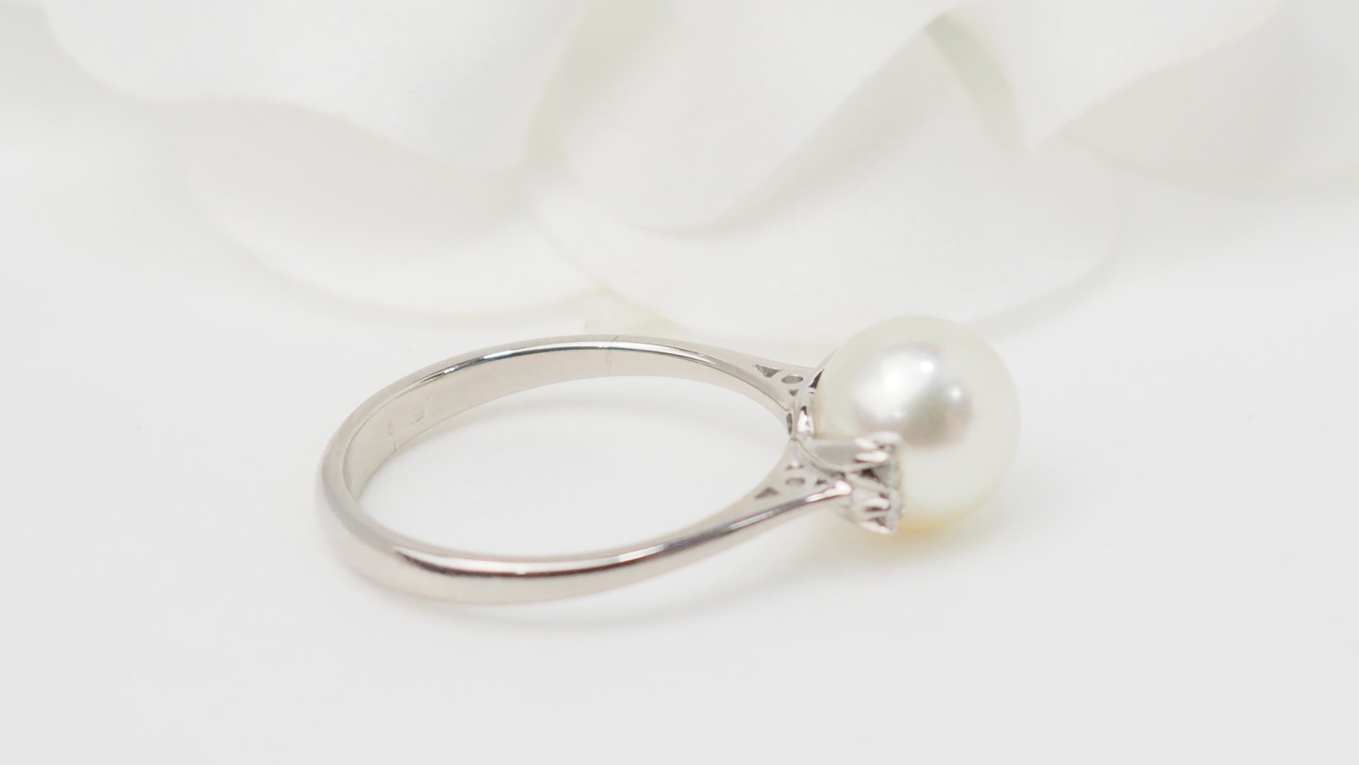 Bague en or blanc 18kt/750 millièmes, Ornée d'une perle de culture diamètre 8,5mm, Epaulée de deux brillants pour un poids total d'environ 0,04ct, Poids 3,60gr, Tour de doigt: 55.