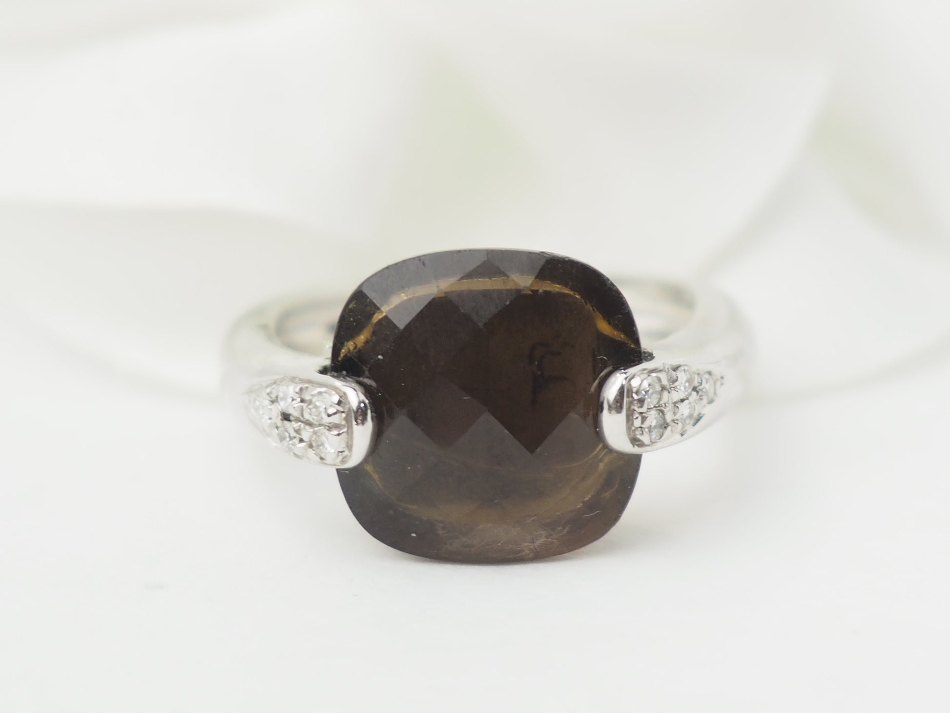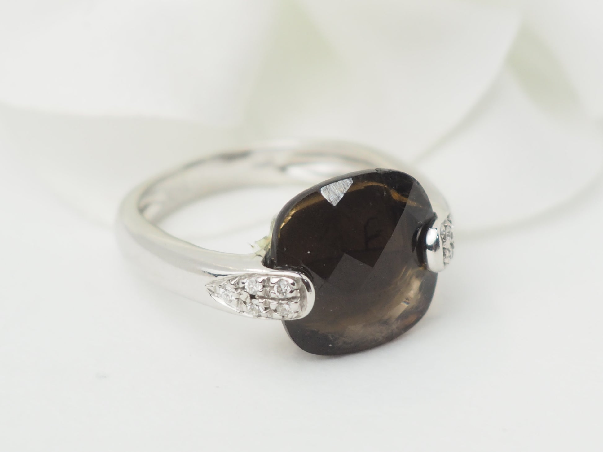 Bague en or blanc, quartz fumé et diamants