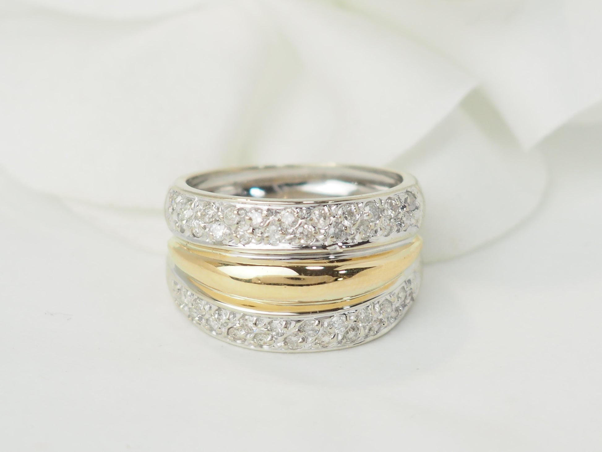 Bague jonc en or jaune et blanc 18kt/750 millièmes, sertie de diamants pour un poids total d'environ 0,42ct, Poids 6,09gr, Tour de doigt : 52, Epoque vintage.
