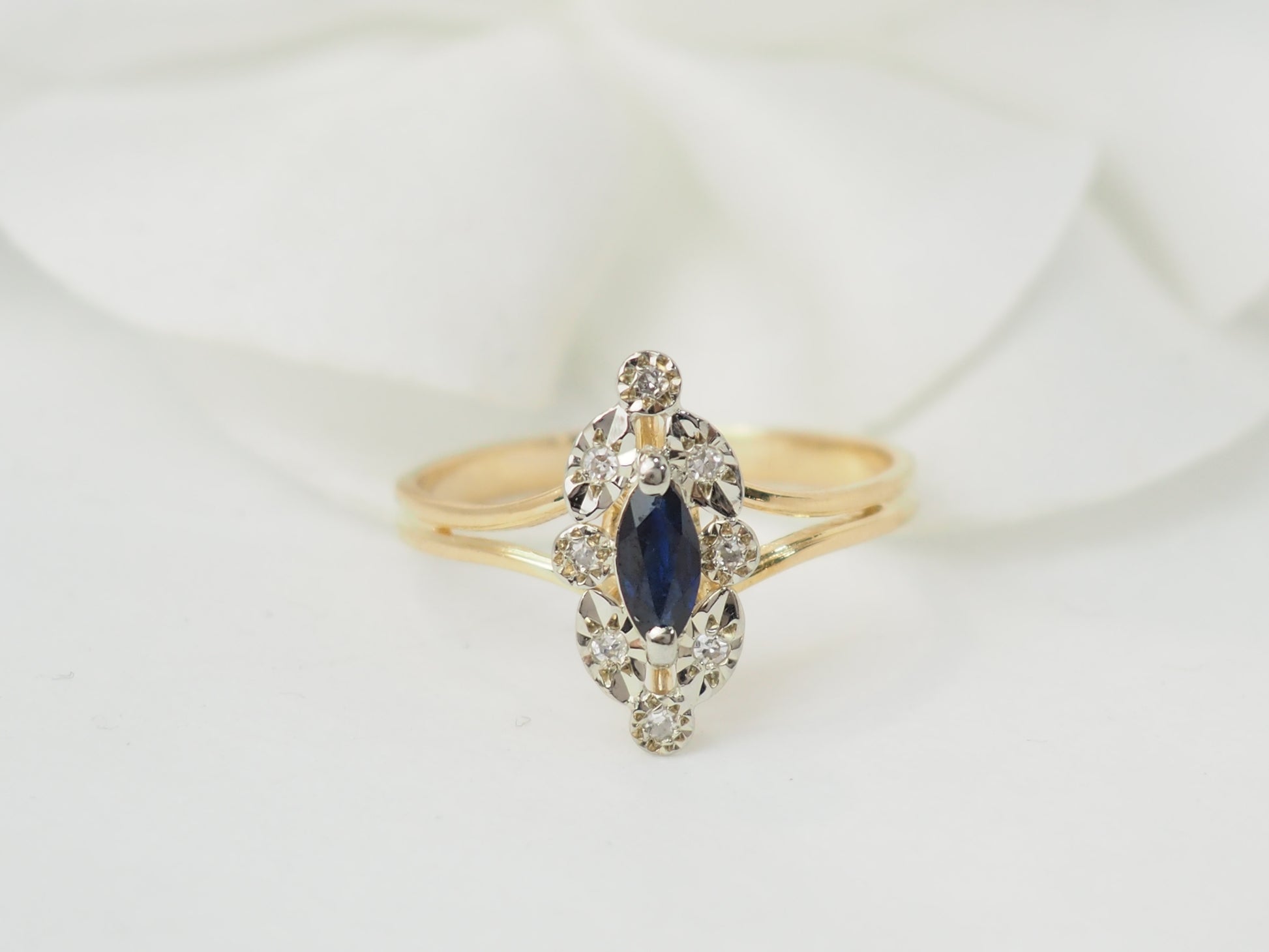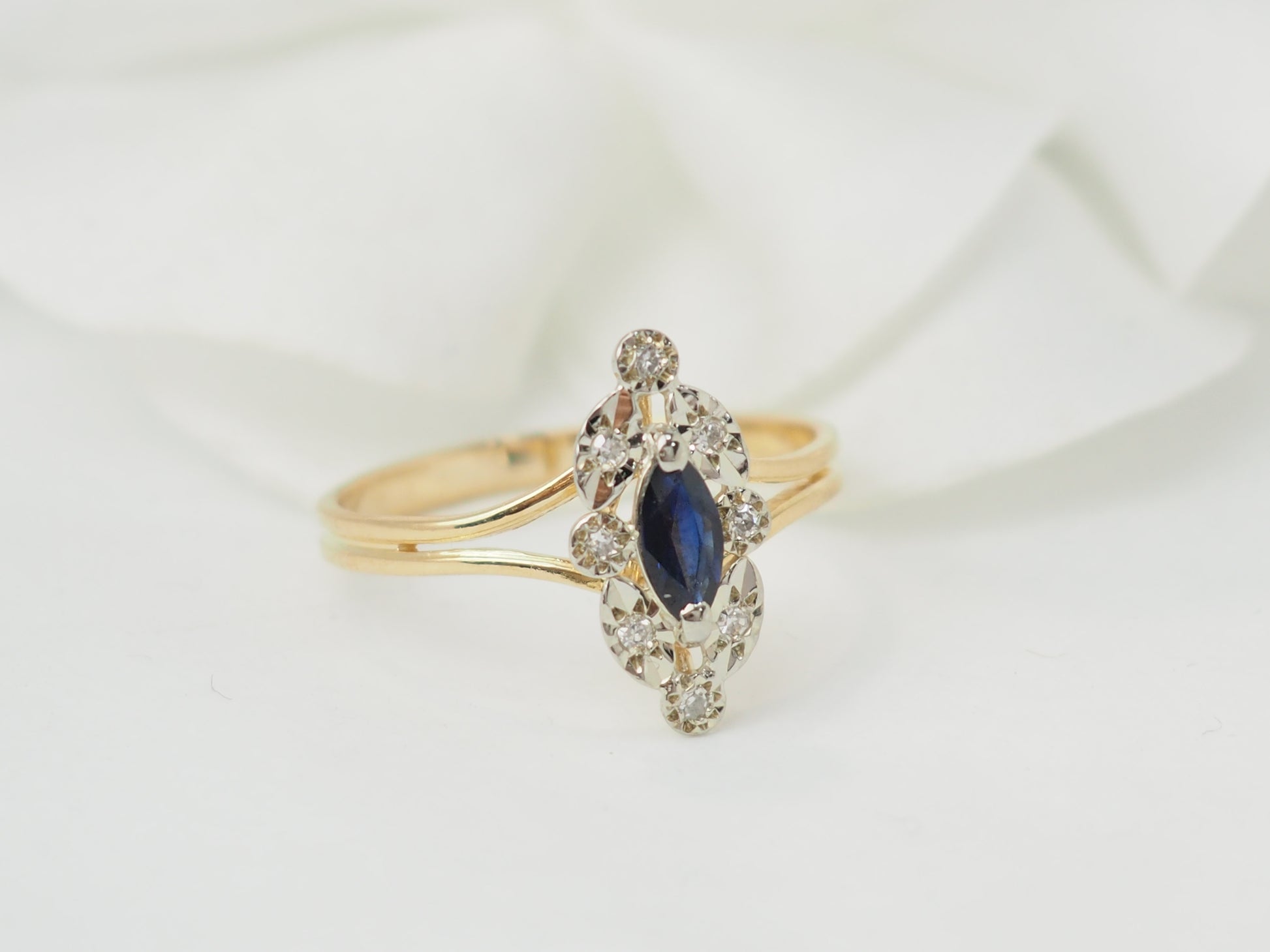 Bague ; Or jaune 18kt/750millièmes ; Centrée d'un saphir taille navette d'environ 0,20ct ; Entouré de diamants pour un poids total d'environ 0,04ct ; Poids : 2gr ; Tour de doigt : 52,5 ; Dimensions plateau : 13,5x7mm ; Epoque : vintage.