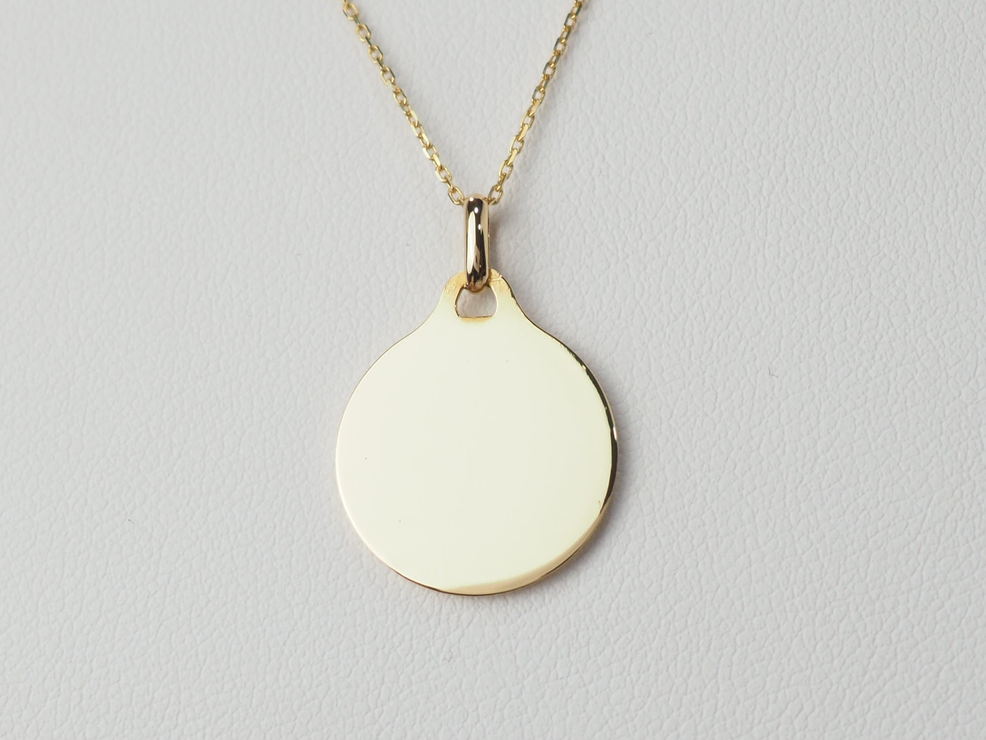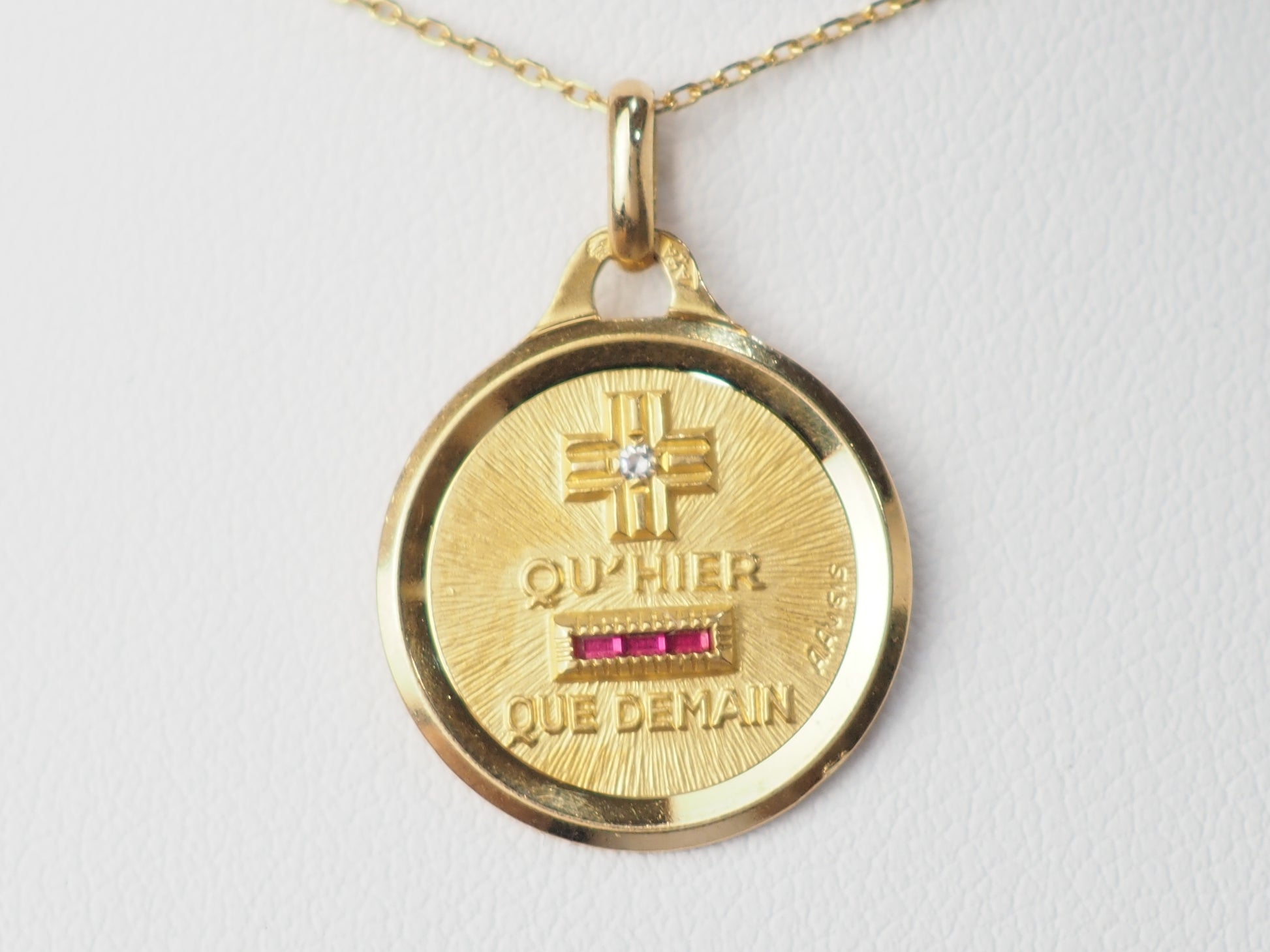 Pendentif médaille d'amour Augis + qu'hier - que demain, or jaune 18kt/750 millièmes, serti d'un diamant taille 8x8 et 3 rubis calibrés, Poids 2,12gr, Diamètre 16 mm.